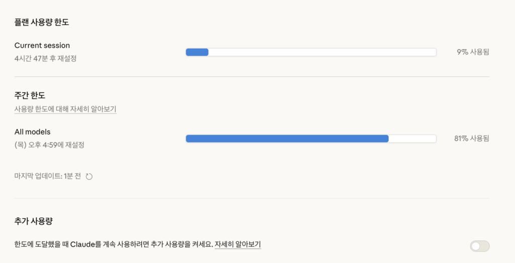 처음에는 이 모든 것을 클로드 코드로 해결하려다 보니 사용량 한도에 걸리고, 기다리고, 다시 걸리는 악순환이 반복되었다.