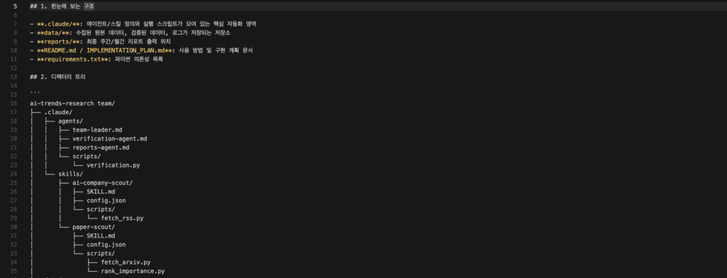 “이 부분을 자동화할 수 없을까?” 고민하던 중 클로드 코드를 접하게 되었고, Sub-Agent와 Skill 개념을 활용하면 리서치 자동화가 가능할 것이라는 생각이 들었다. 그래서 시작한 것이 클로드 코드를 활용한 AI 트렌드 리서치 에이전트 팀 구축이다. 직접 구축하면서 겪은 시행착오와 얻은 팁을 공유해보고자 한다.