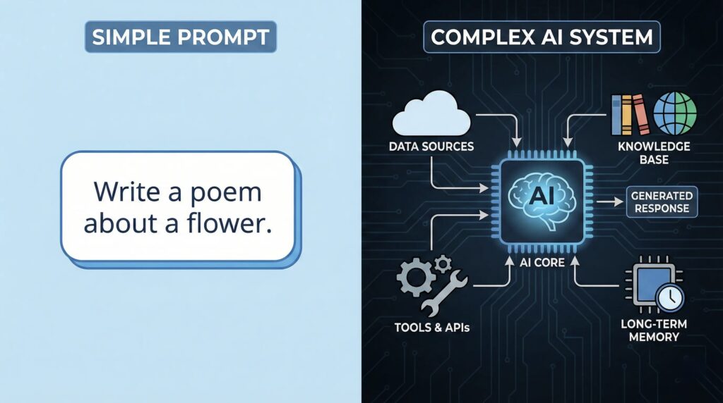 프롬프트 엔지니어링은 “어떻게 질문할 것인가”에 집중한다. “차근차근 단계별로 설명해줘”처럼 질문 방식을 개선하는 기술이다. 반면 컨텍스트 엔지니어링은 “어떤 정보를 제공할 것인가”에 초점을 맞춘다.