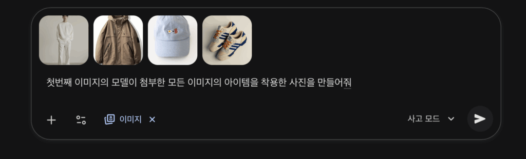 모델 사진과 여러 아이템 이미지를 업로드하고 원하는 스타일로 조합을 요청하면 된다. 포즈, 배경, 조명까지 원하는 대로 조정할 수 있다.