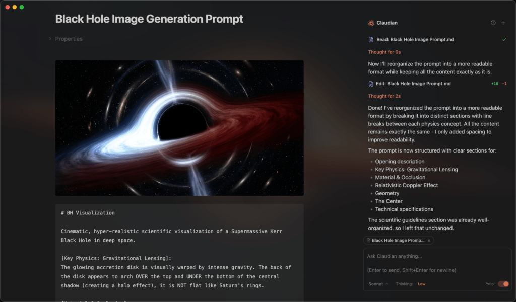 Claudian은 이 문제에 대한 꽤 급진적인 답이다. Obsidian 사이드바에 Claude Code를 통째로 집어넣는 오픈소스 플러그인인데, 단순한 AI 채팅이 아니라 파일을 읽고, 쓰고, 폴더를 만들고, bash 명령까지 실행하는 에이전틱(Agentic) AI를 노트 앱 안에서 돌릴 수 있게 해준다.