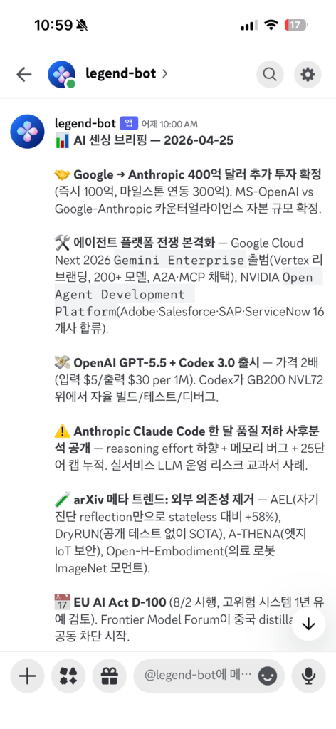 이 루틴이 박힌 뒤로 비서를 쓰는 빈도가 확연히 달라졌다. 아침 7시 30분에 디스코드에 “오늘 미팅 3개, 어제 처리 못한 follow-up 2건, 미세먼지 나쁨”이 떠 있으면 자연스럽게 답장하게 된다. 비서는 먼저 말 걸어야 산다.